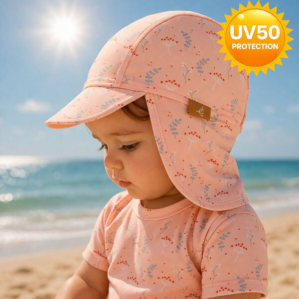 Шапката на Fresk е тип „легионер“, с UV50 защита и предпазва главичката, ушичките и врата на детето.