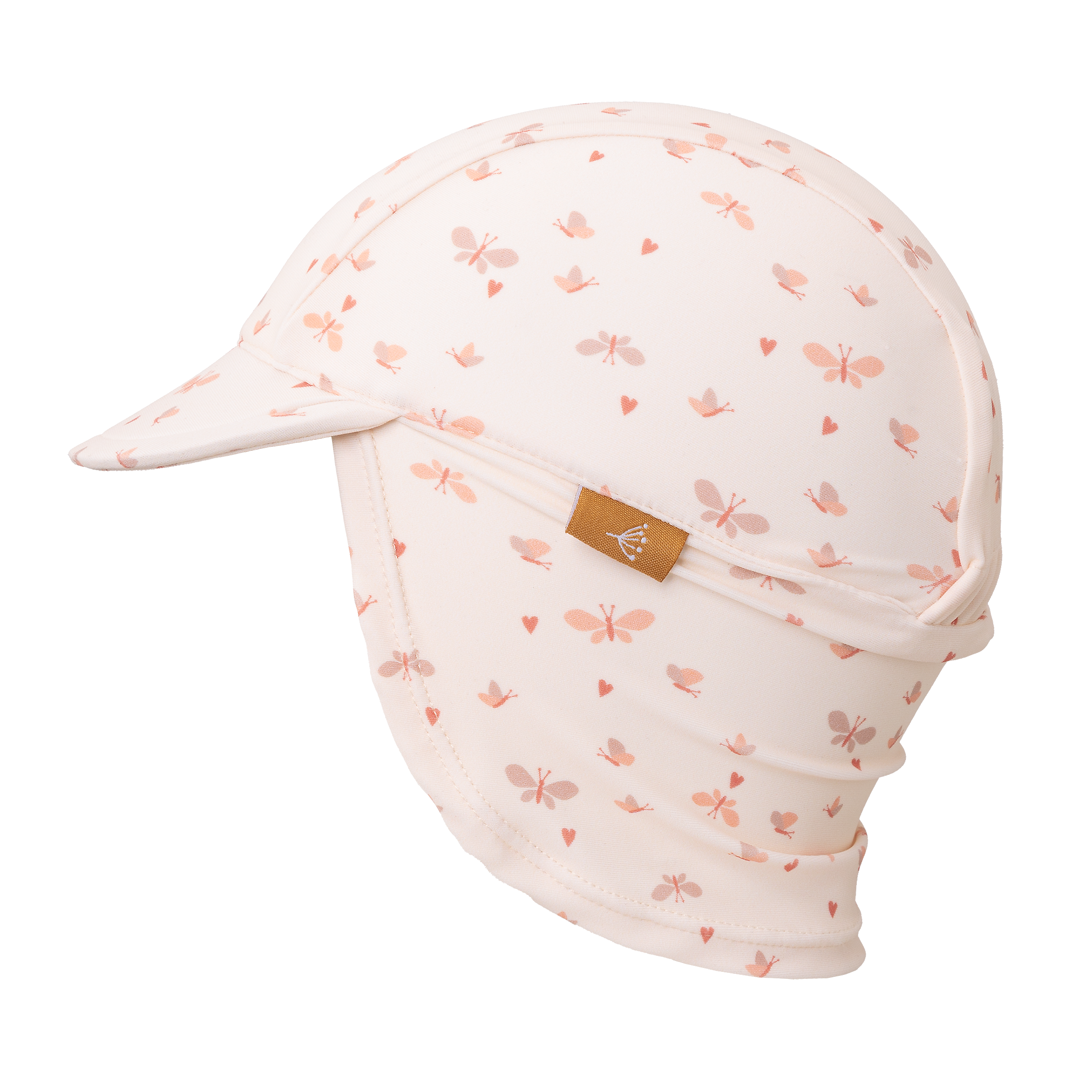 Шапката на Fresk е тип „легионер“, с UV50 защита и предпазва главичката, ушичките и врата на детето.