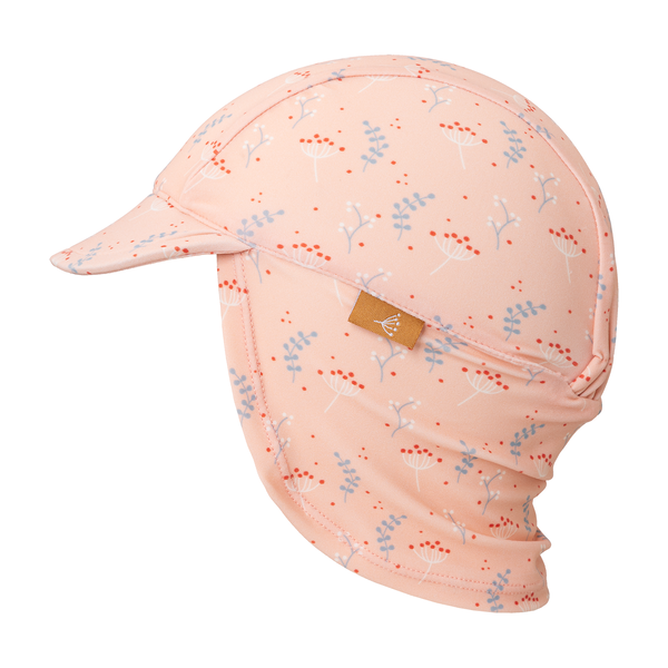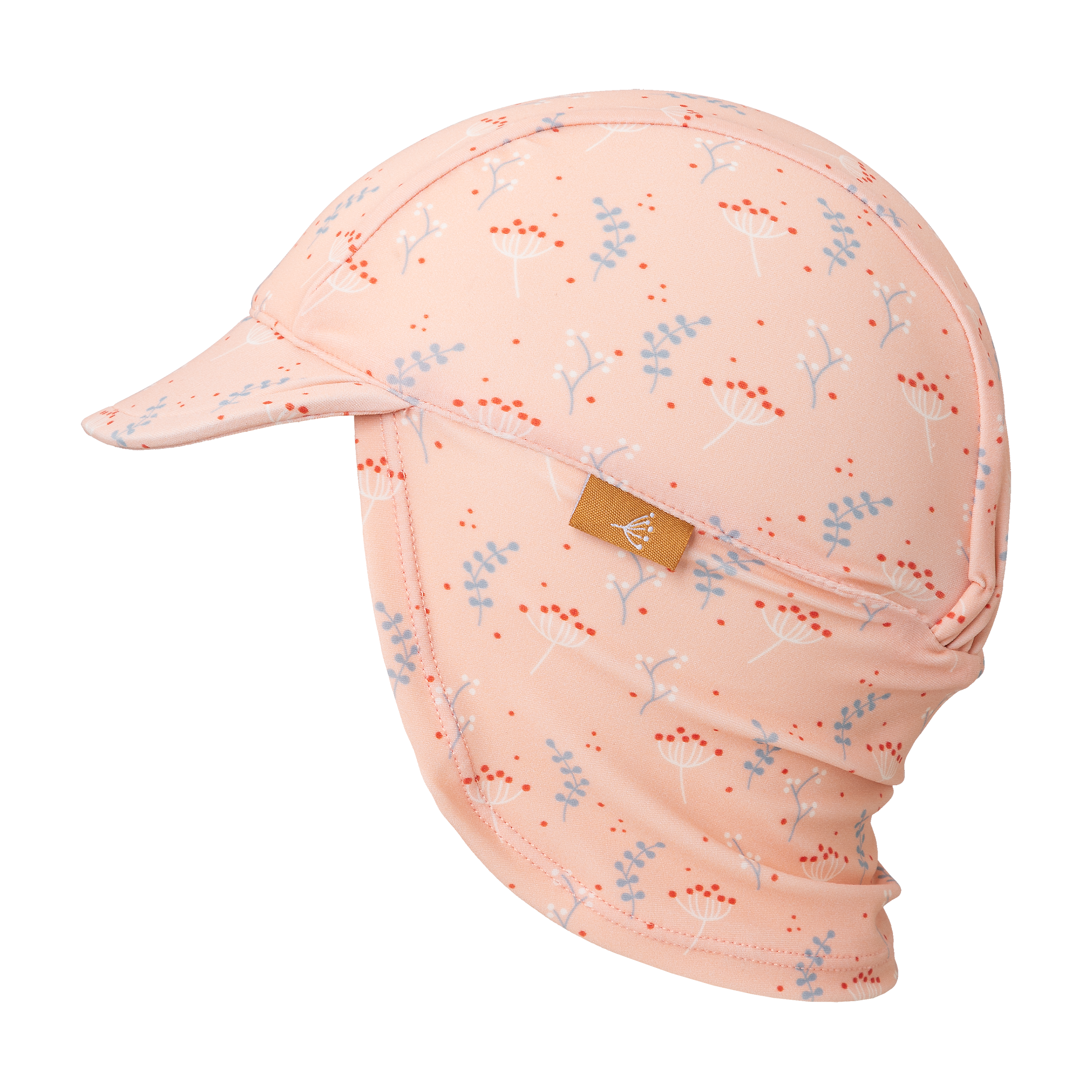 Шапката на Fresk е тип „легионер“, с UV50 защита и предпазва главичката, ушичките и врата на детето.