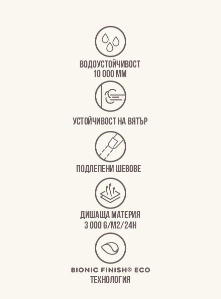 - Bionic-Finish® ECO – водоустойчива защита без вредни химикали. Дрехата отблъсква вода, остава дишаща и безопасна за детската кожа, като същевременно е по-приятелска към природата.