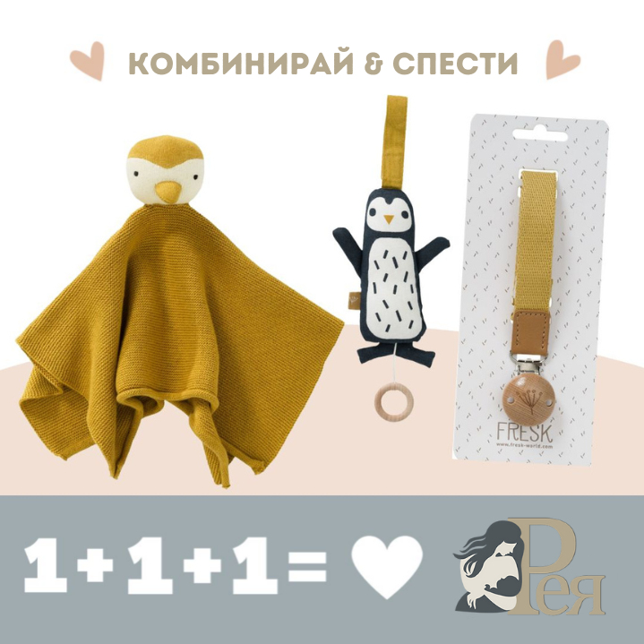 Един страхотен бебешки бокс от любимият ни еко бранд Fresk, който съдържа в себе си три незаменими продукта : Сладко утешителче, изработено от 100% органичен памук, клипс за биберон в същият десен и музикалка детска играчка пингвинче