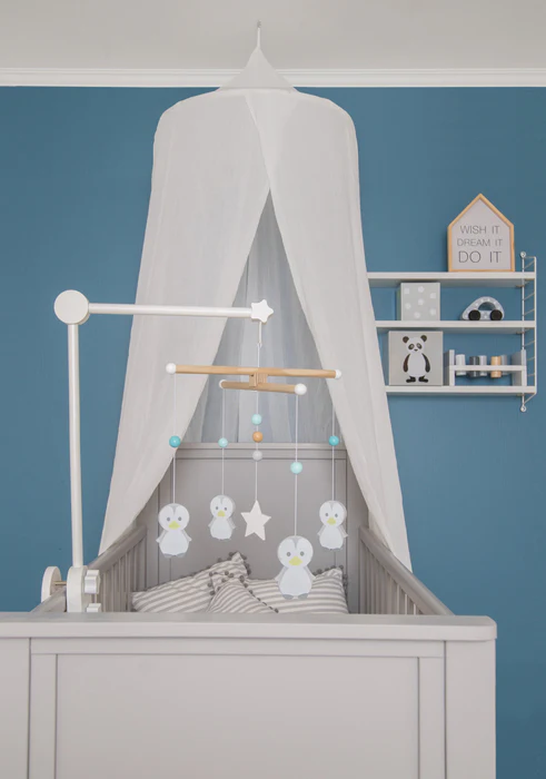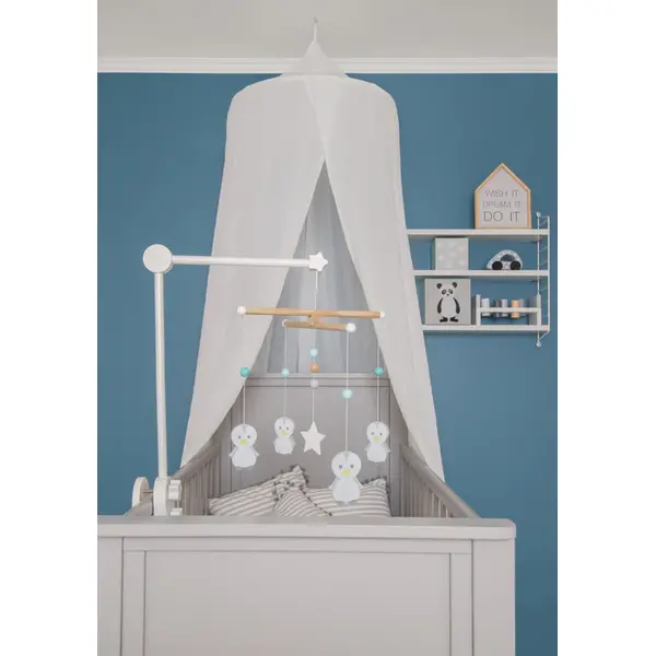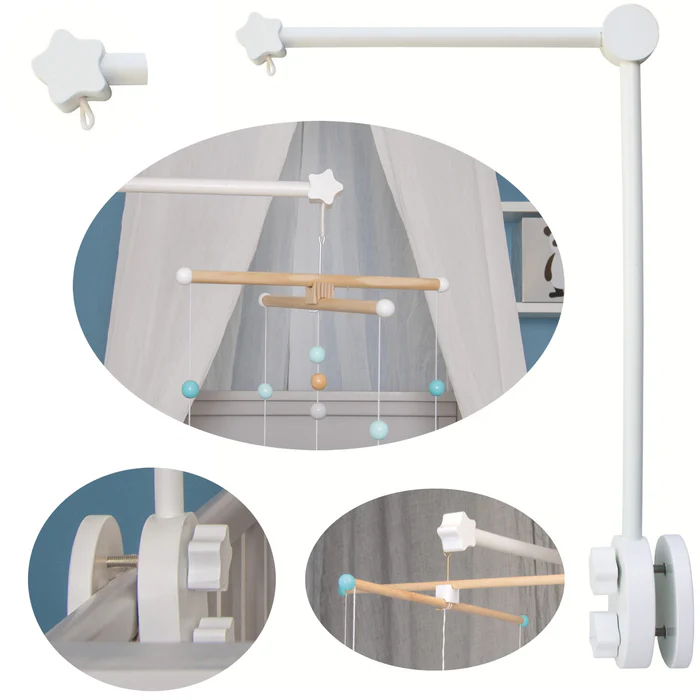 Стилна, дървена стойка с бяло лакирано поритие, която ще държи любимите играчки на Вашето дете, над бебешката люлка/кошара!