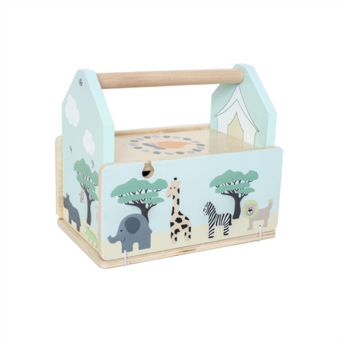 След приключване на играта, елементите се прибират в куфарчето и така то може да се съхранява и пренася лесно на различни места. Дървеното Сафари спомага за развитието на двигателните умения и ще научи децата на различни видове животни.