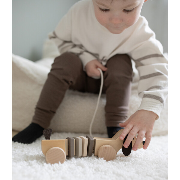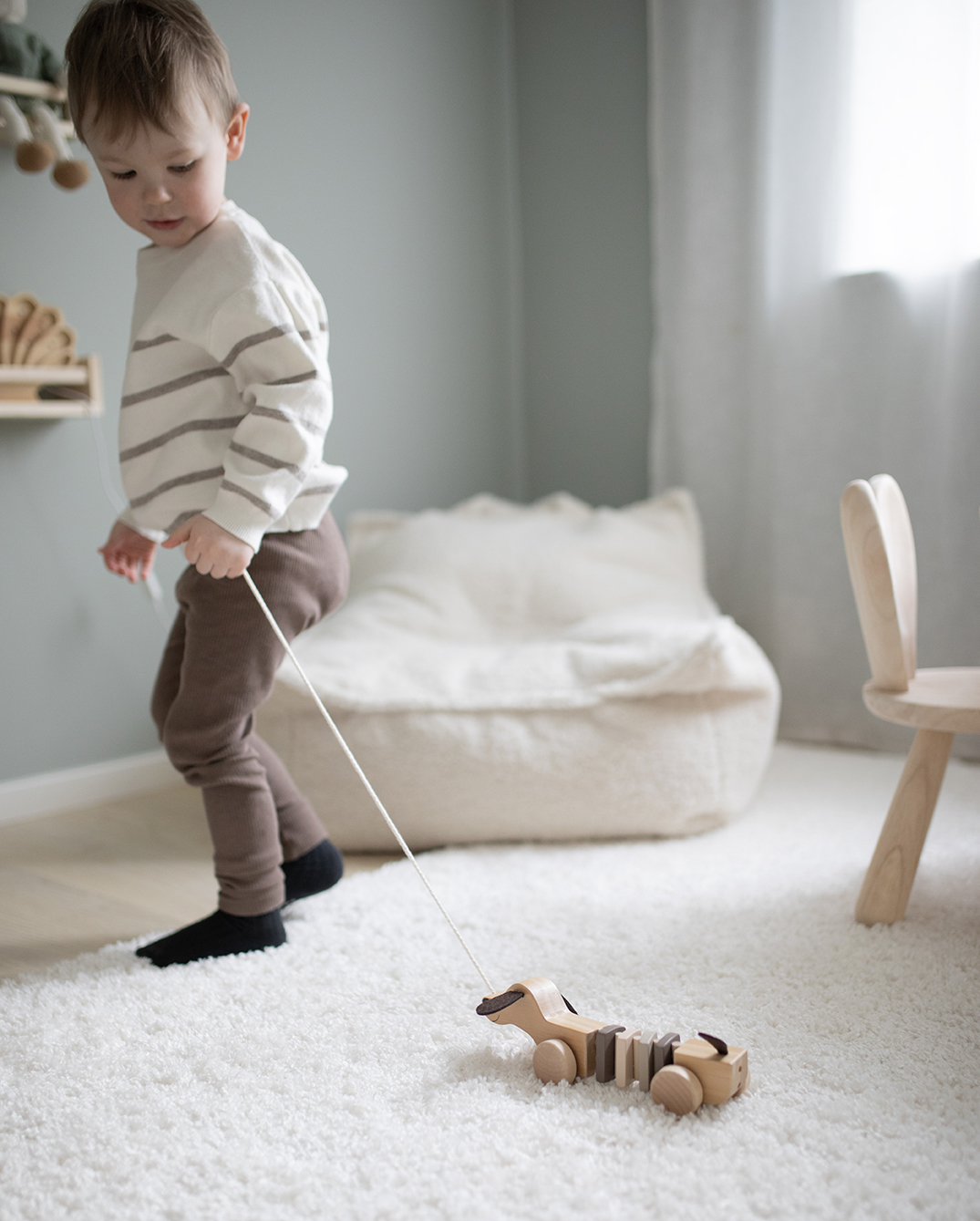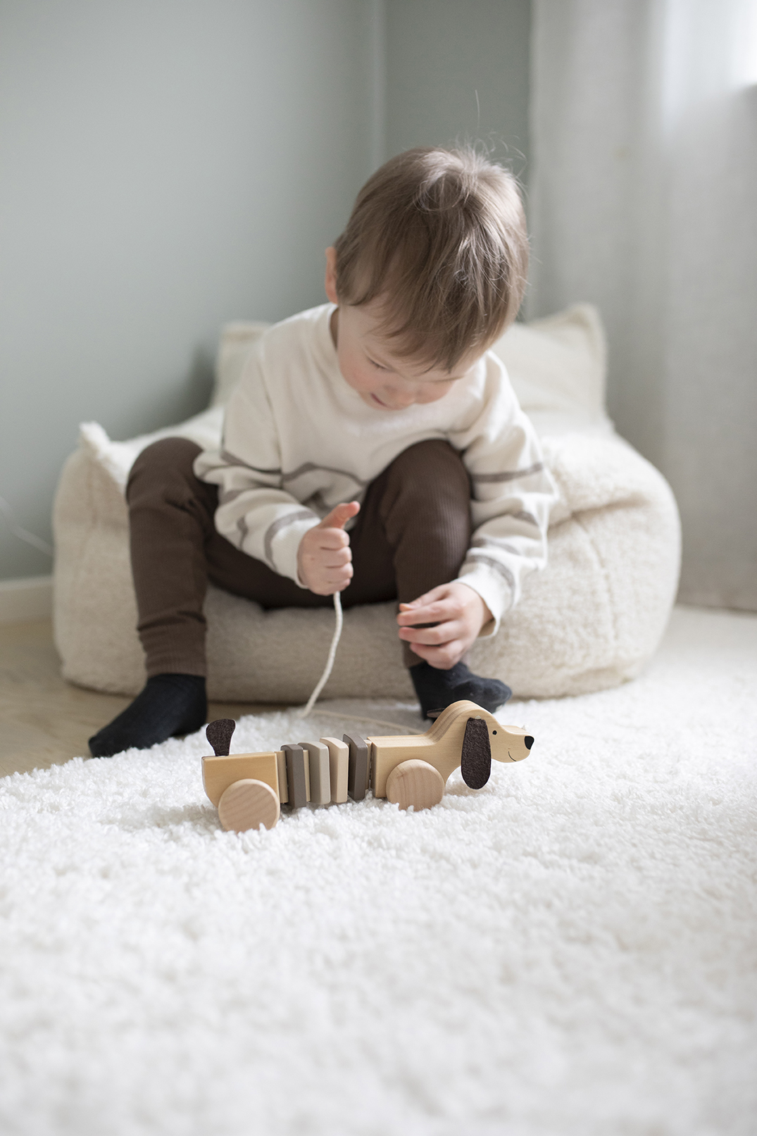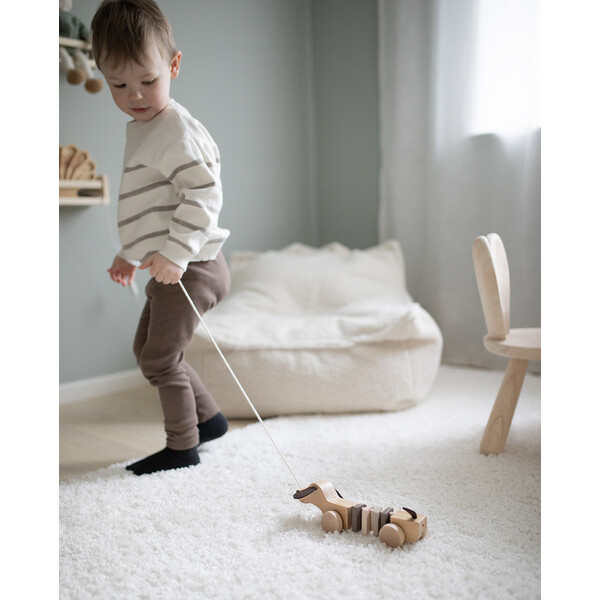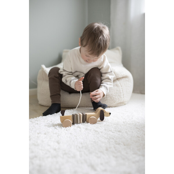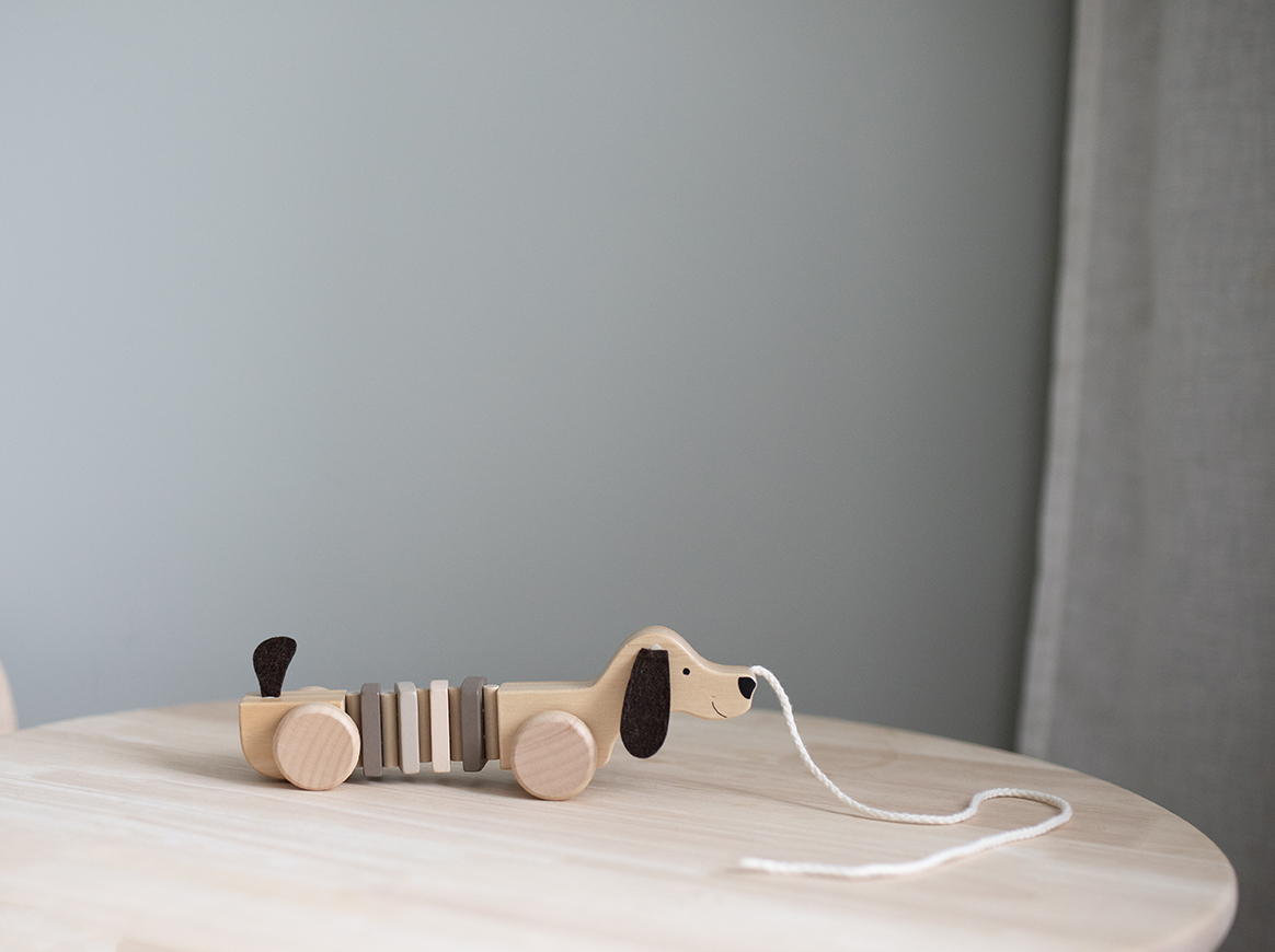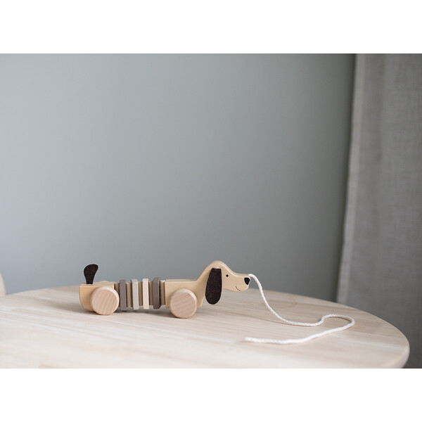Издърпайте цветното кученце, което има две колела като крачета, върху всякаква повърхност и се насладете на играта!