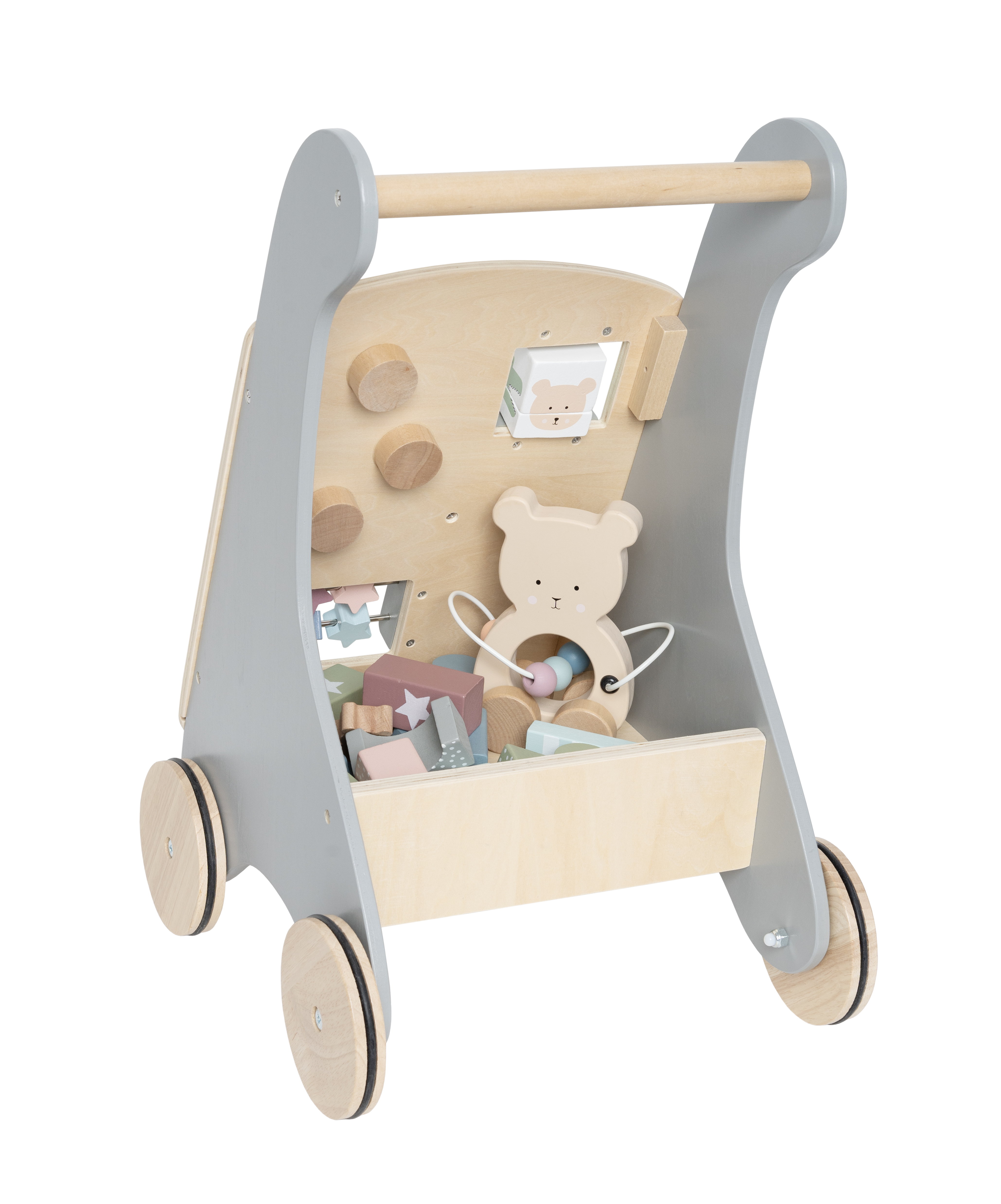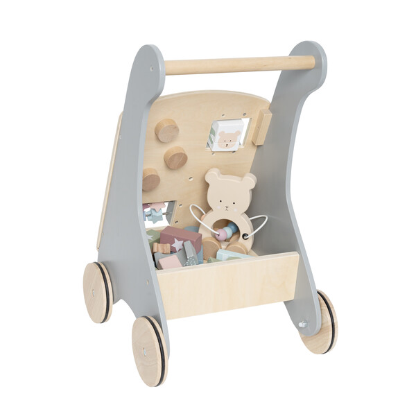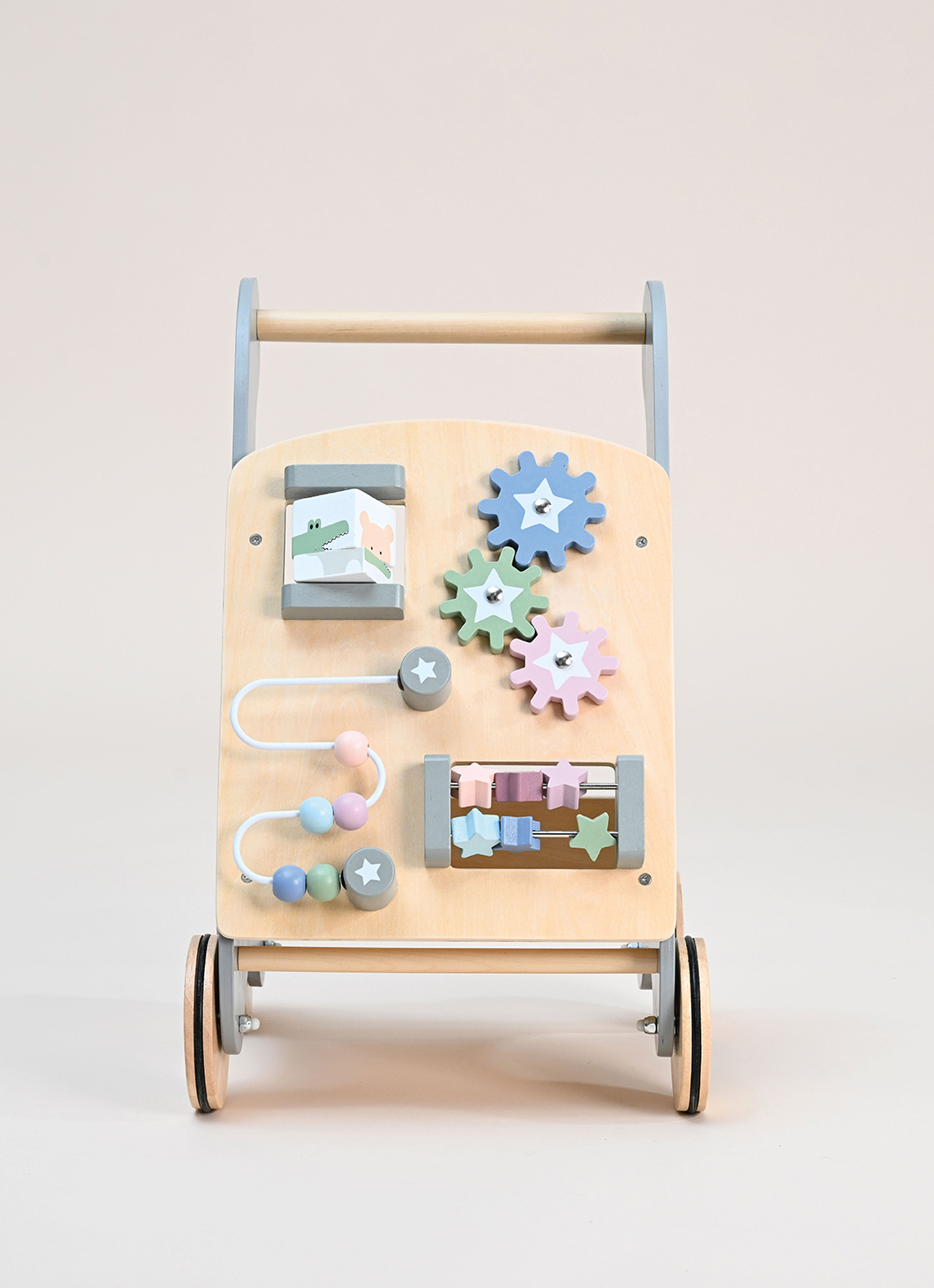 Проходилката е ръчно рисувана отстрани, а отзад има кутия за съхранение, където можете да поставите всички любими играчки на детето.