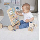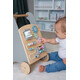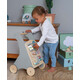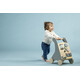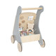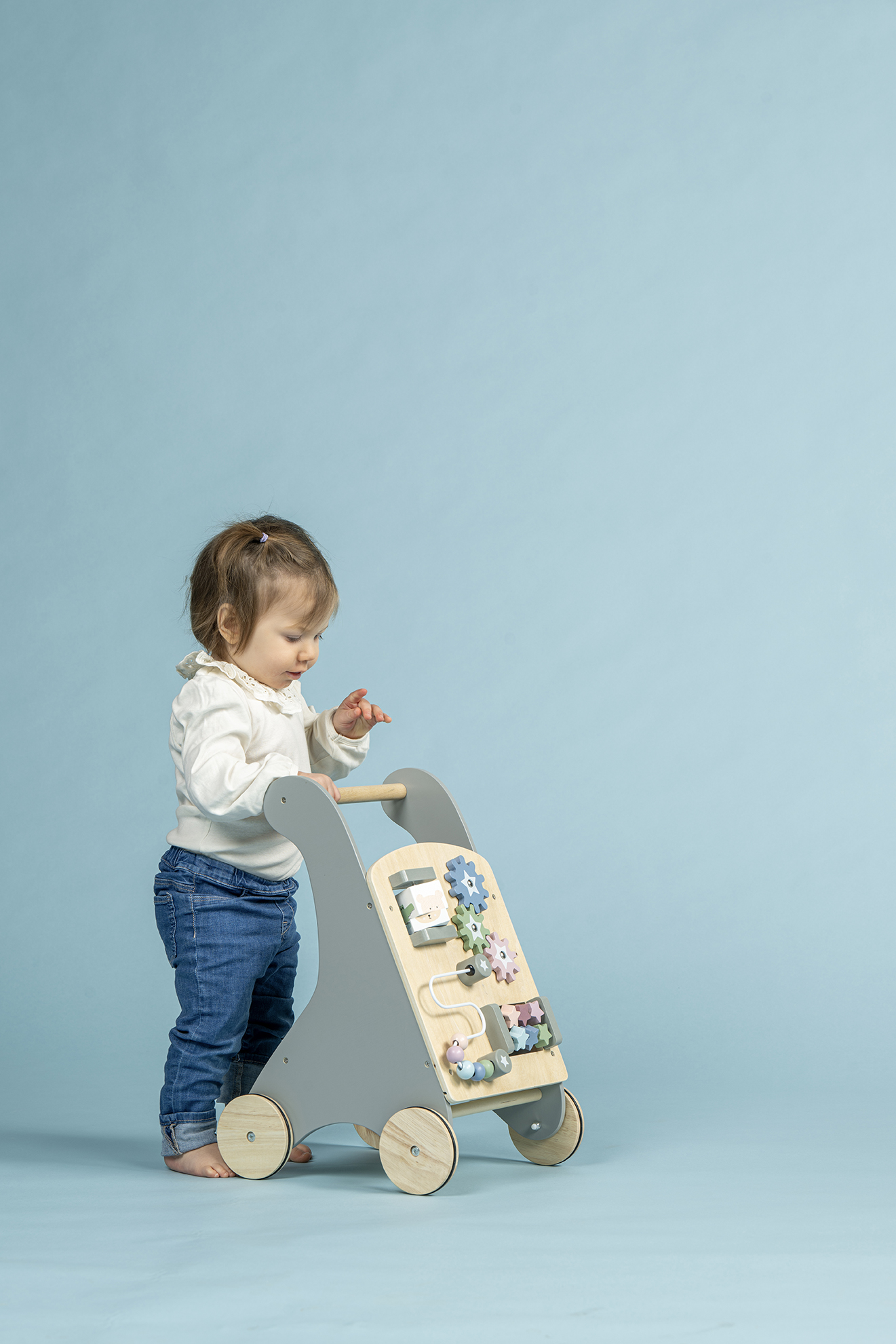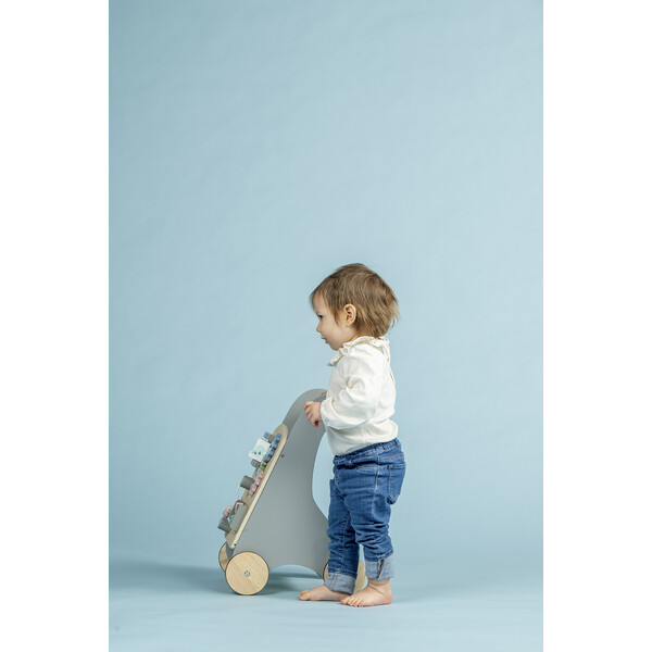 Количката има твърди дървени колела с гумени накрайници, така че се движи лесно, без да оставя следи по пода, а детето може лесно да я управлява.