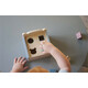 Дървената кутия е в мек цвят, включваща подвижен капак и различни форми в различни цветове, за да съответства на различните отвори.