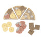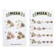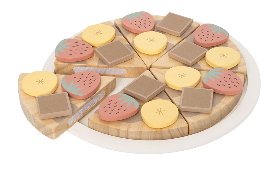 Горните части на пицата са прикрепени с велкро. Всички 6 парчета също се държат заедно с велкро и лесно се отделят с помощта на дървена ножичка за пица. Поднесени са на чиния и идват в истинска кутия за пица.