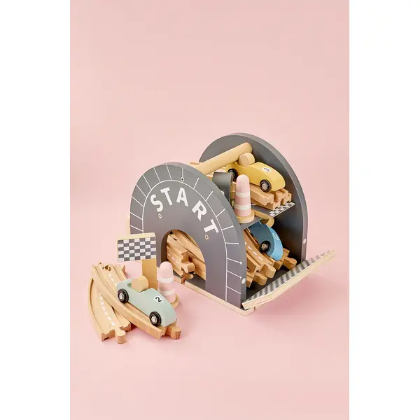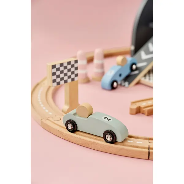 Пистата е с овален дизайн, плавни завои, ясно обозначена старт–финал линия и впечатляваща многоетажна рампа, от която количките се спускат с ускорение. Идеалната игра за малките почитатели на "високите скорости" - било то за приятелско състезание или за най-вълнуващия „детски шампионат“ у дома!