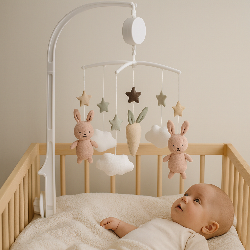 Тя възпроизвежда нежна, успокояваща мелодия, докато красивите зайчета и морковчета се въртят плавно.