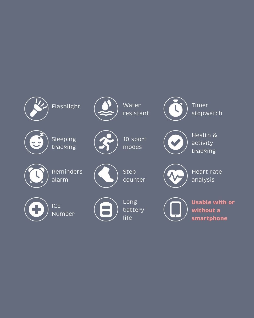Може да се свърже със смартфон за известия и синхронизация, но също така работи автономно.