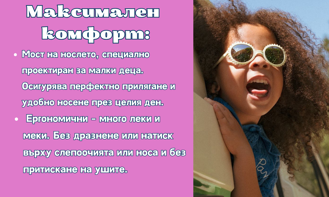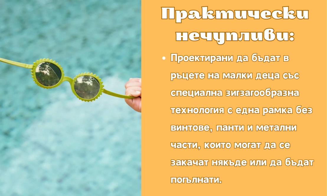 • Не забравяйте, че регулируемата връзка на очилата за възраст 0–4 години ще помогне да ги задържите на място.