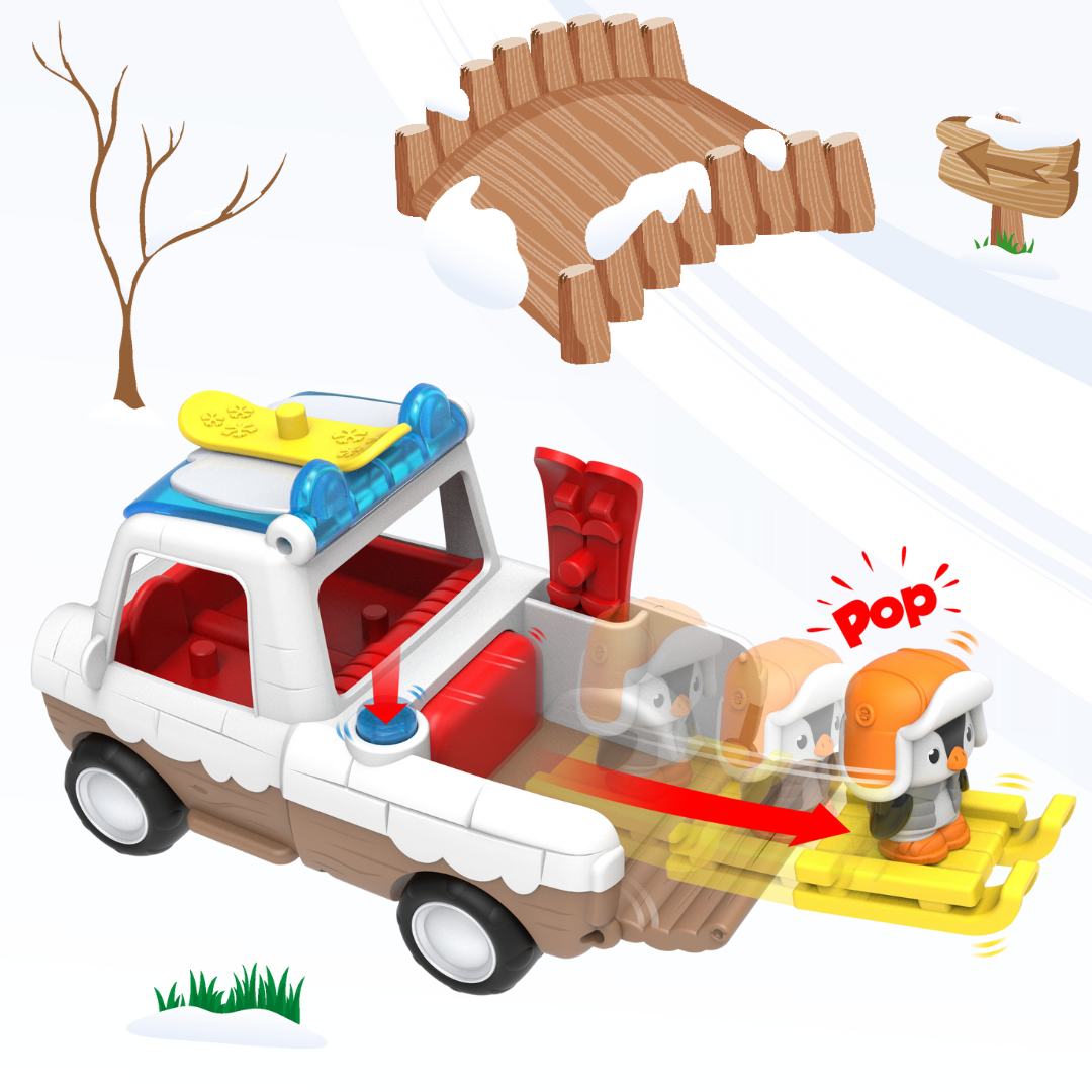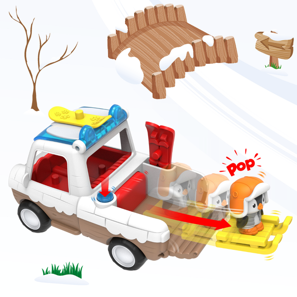 Отправете се на приключение по снежните писти с фантастичния джип, който отвежда малкия изследовател в света на фантазията. С аксесоарите ски, сноуборд и шейни детето ще открие радостта от зимата! Натискането на бутон разкрива скрити изненади, а сладките пингвини правят преживяването още по-магическо.