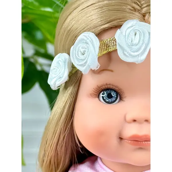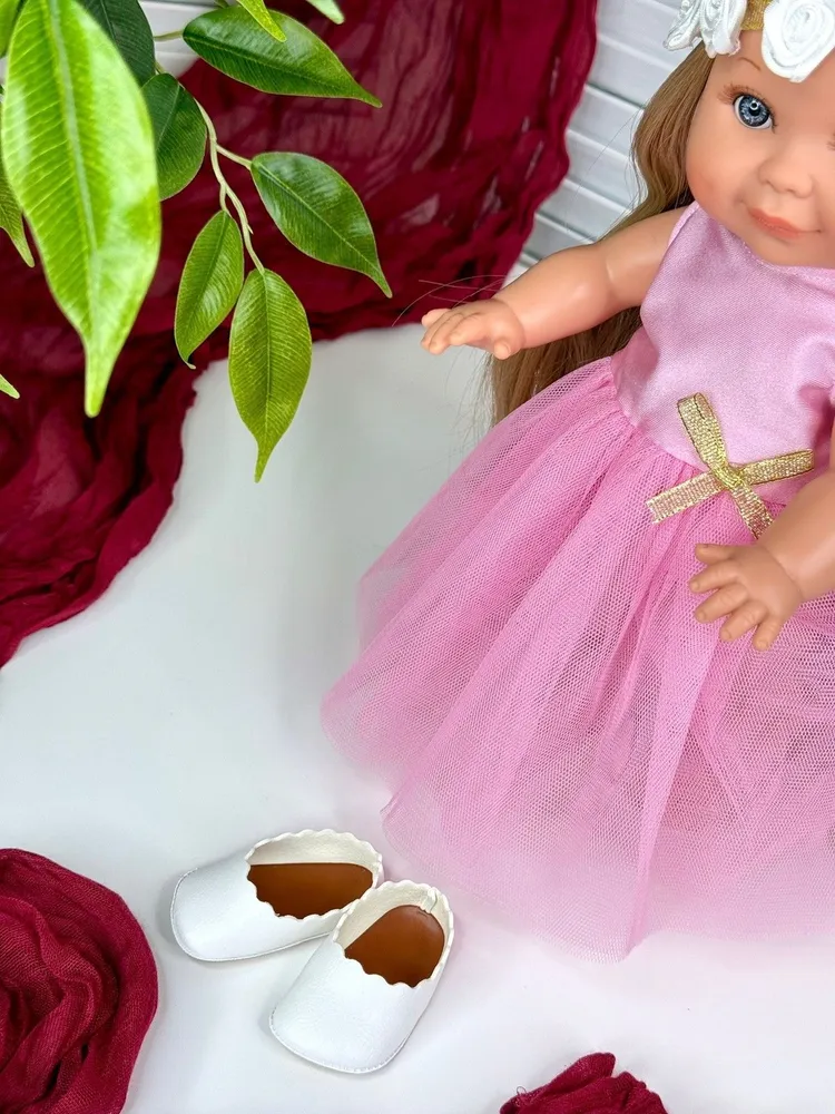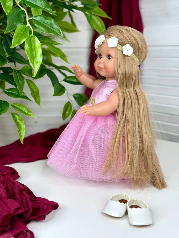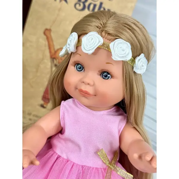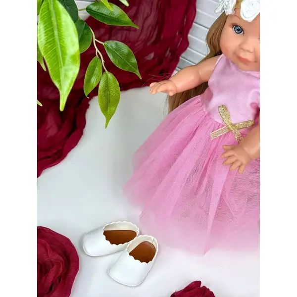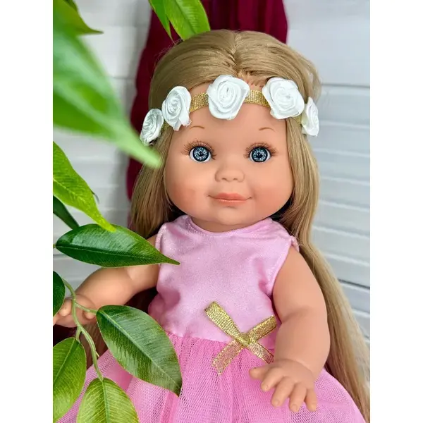 Облечена е с розова рокличка, бели обувки и лента за глава с цветя.