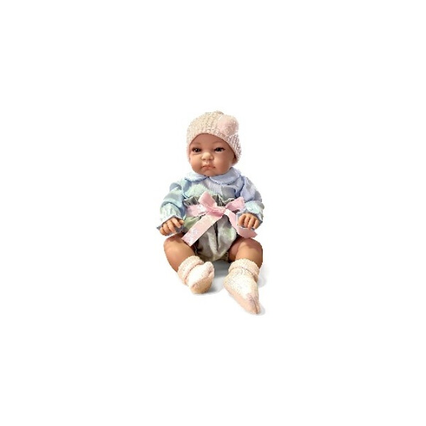 Облечена е с ризка, плетена шапчица и чорапки.
