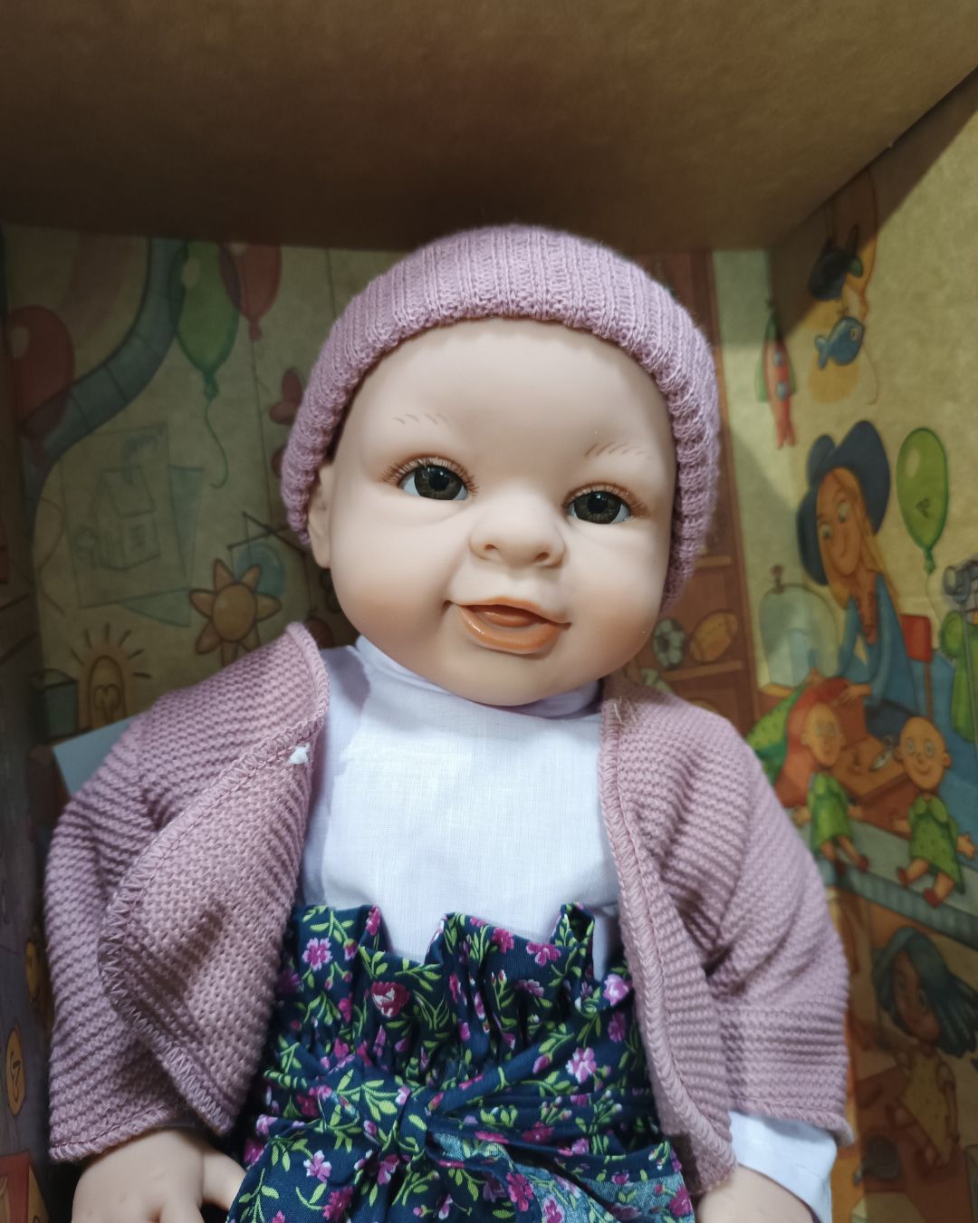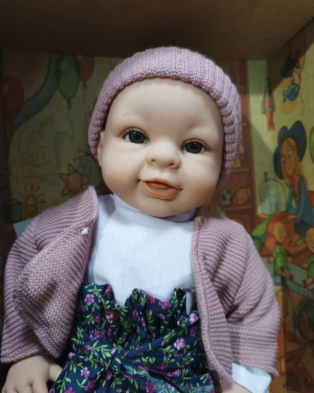 Облечена е с плетено елече, розова шапка и чорапки.