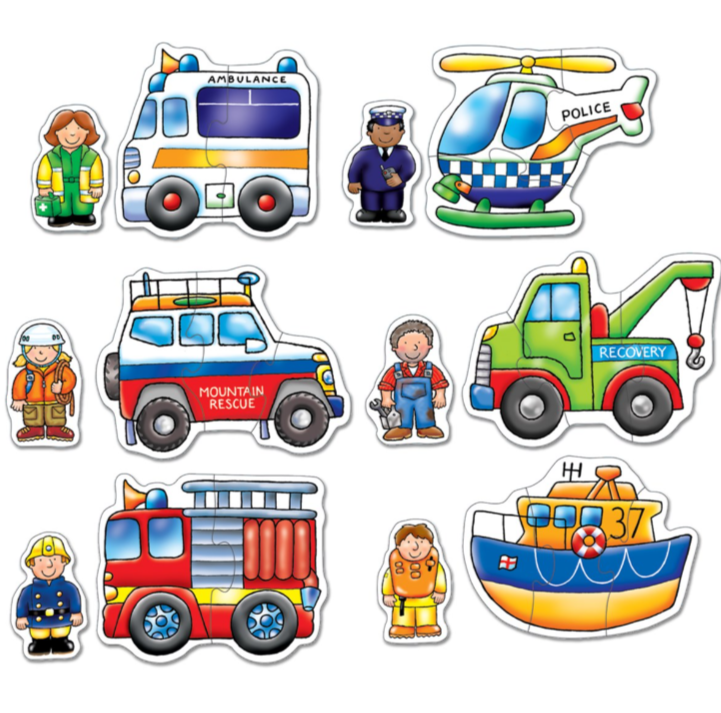 Пъзел, състоящ се от спасители и техните превозни средства! Сравнете парчетата и намерете линейка, планинска кола, полицейски хеликоптер, камион за теглене, пожарна кола и спасителна лодка!