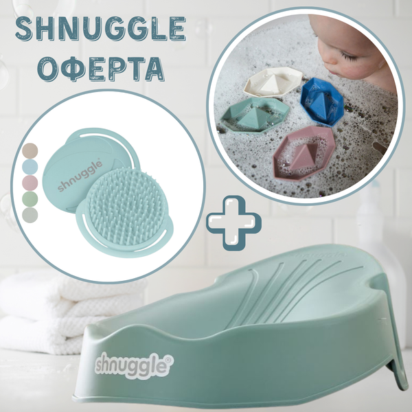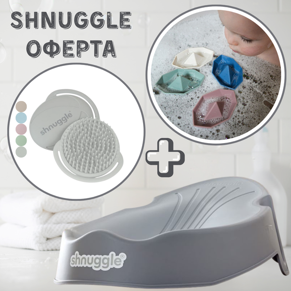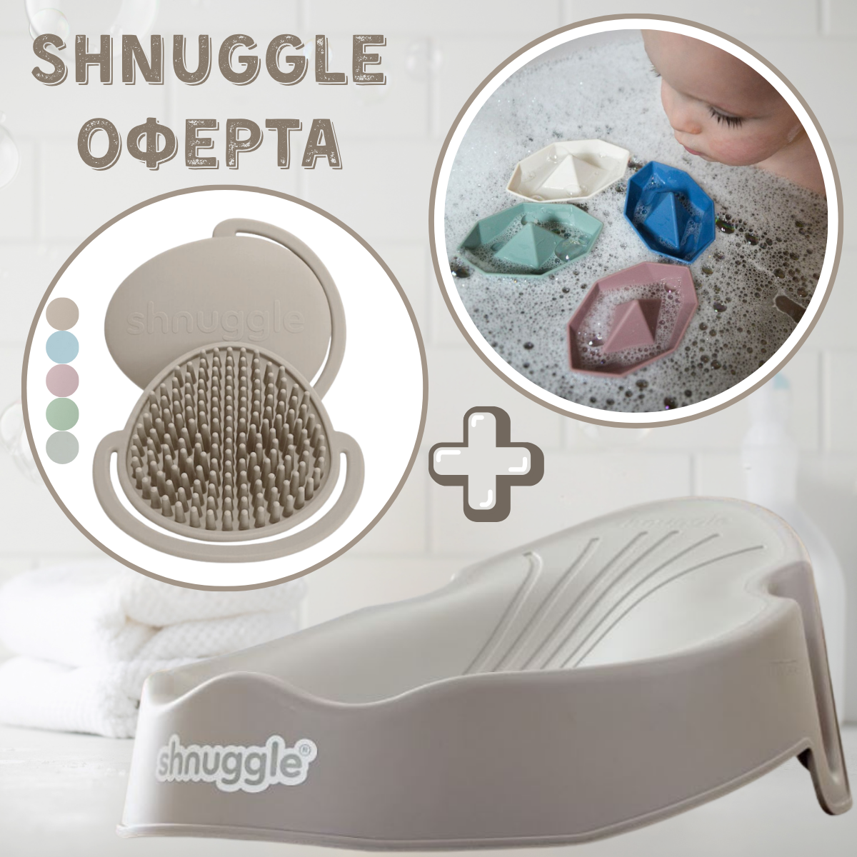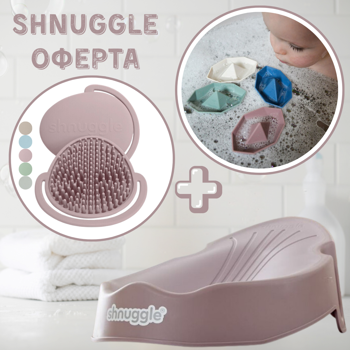 Shnuggle Оферта: "Нужните аксесоари за бебешка баня": Нехлъзгаща се подложка за къпане + Антибактериална четка + Силиконови лодки
