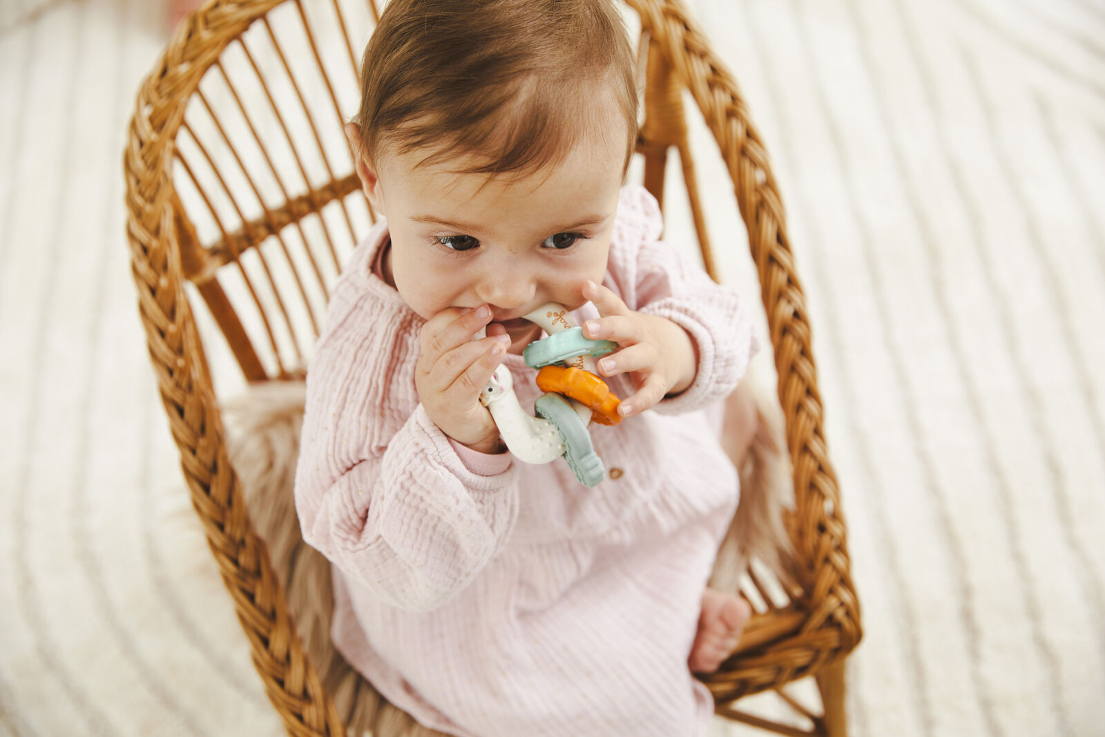 Състои се от ергономично проектиран ринг и три цветни, релефни „пръстена“, специално създадени, за да облекчат венците и да стимулират сетивата на детето.