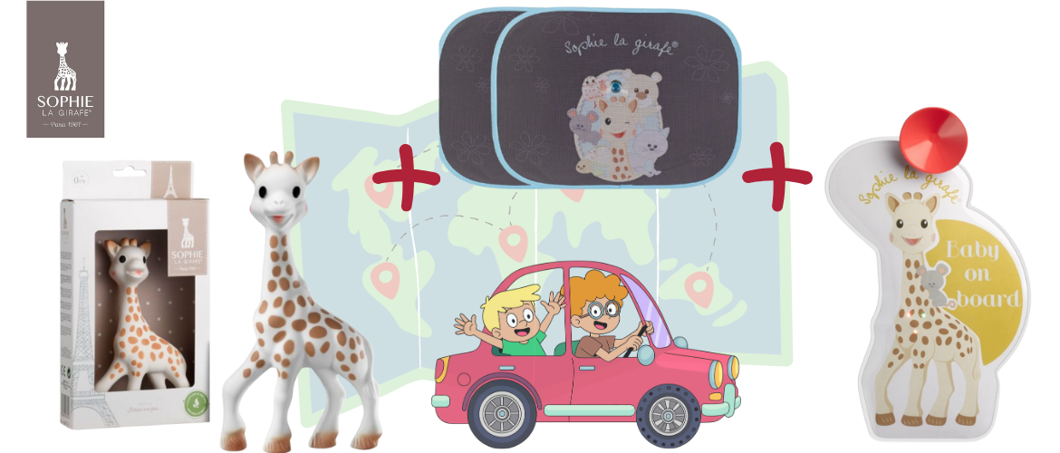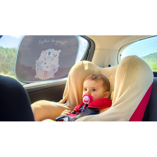 Сенниците на жирафчето Софи блокират вредните лъчи и правят пътуването по-приятно и безопасно.