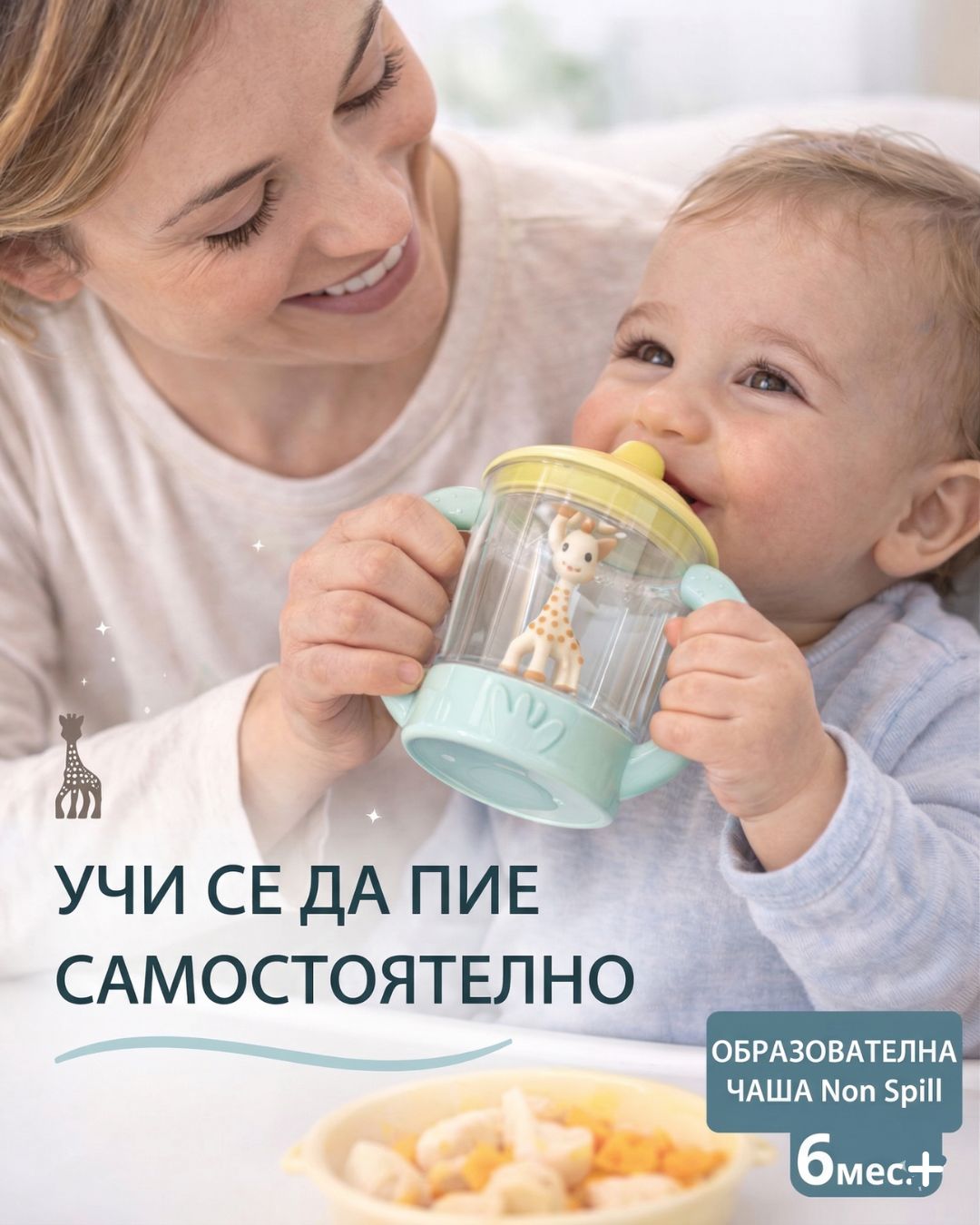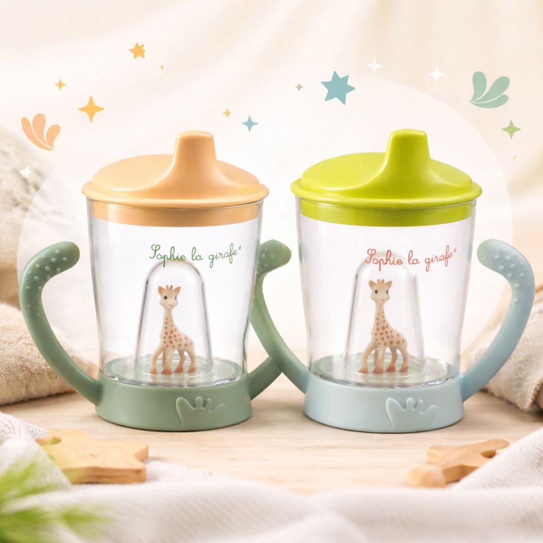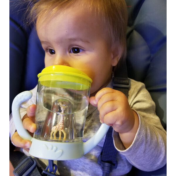 СТРАХОТЕН ДИЗАЙН: Две релефни дръжки за лесно хващане с малки ръчички. Детето ще се зарадва на Софи, която „наблюдава“, докато пие.