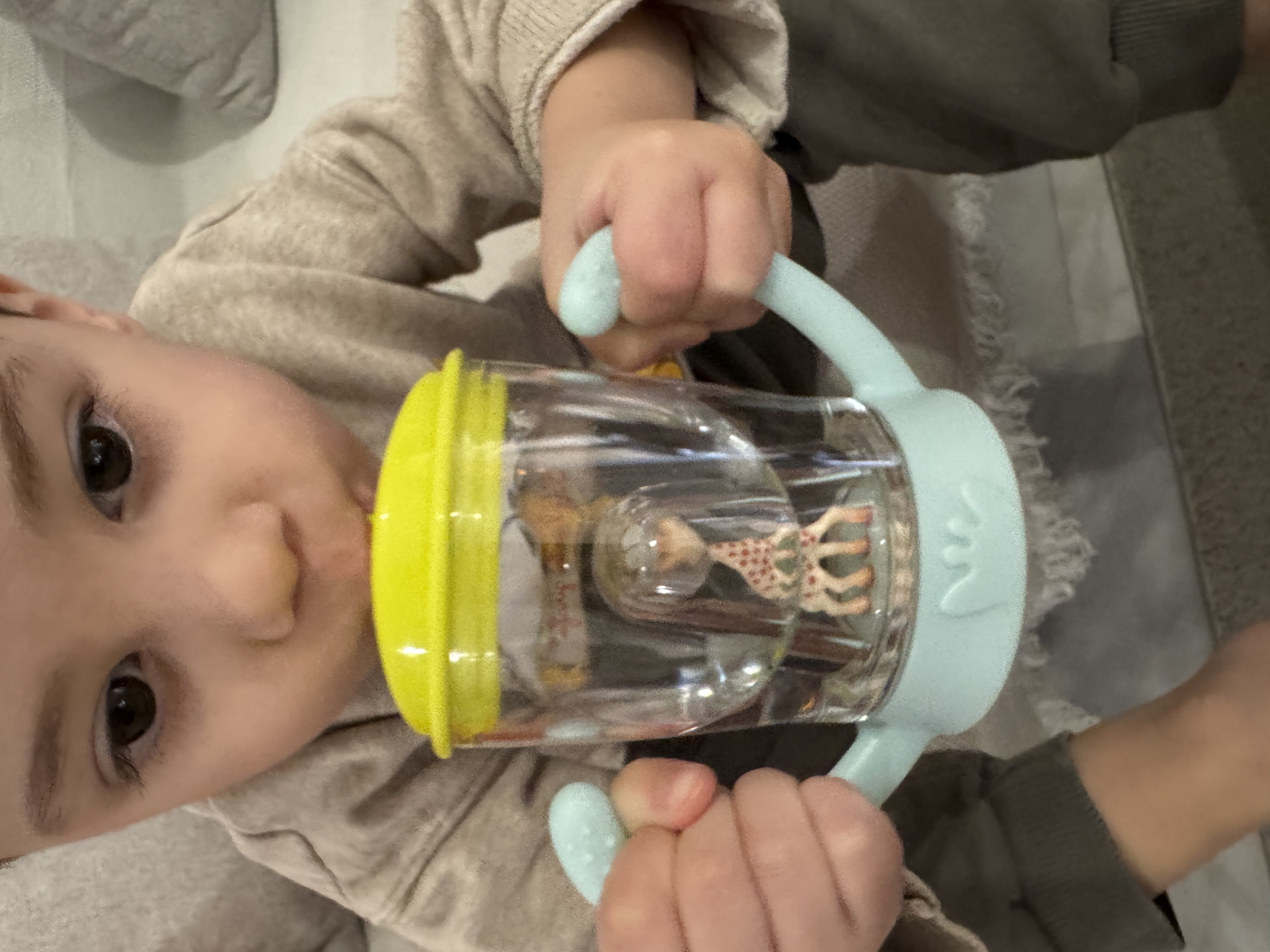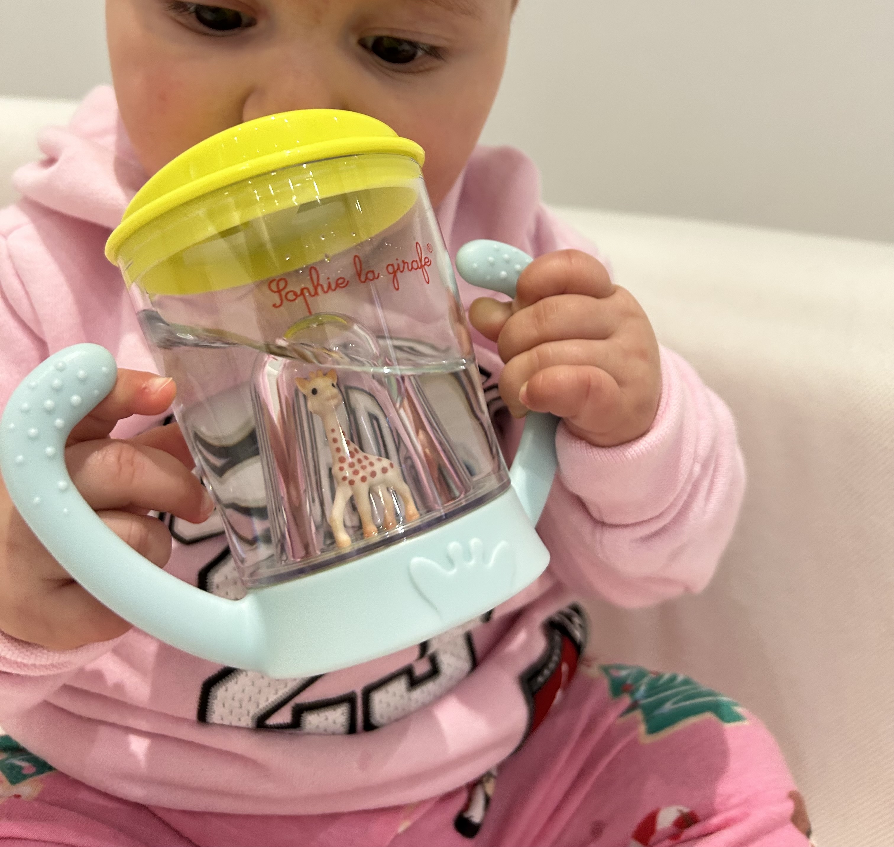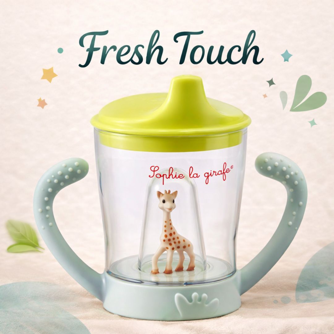 СТРАХОТЕН ДИЗАЙН: Две релефни дръжки за лесно хващане с малки ръчички. Детето ще се зарадва на Софи, която „наблюдава“, докато пие.