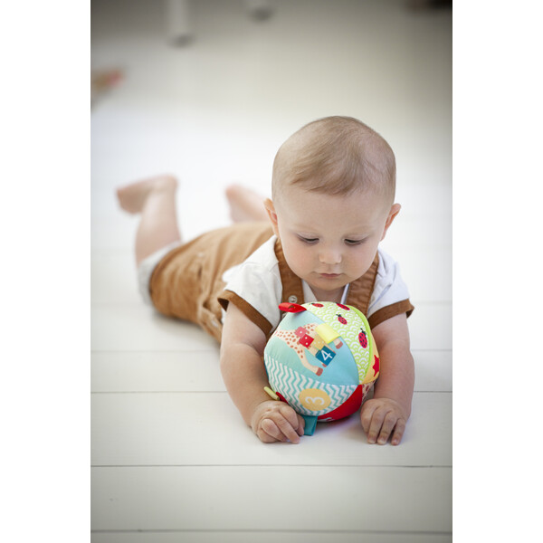 Ярките й цветове ще привлекат вниманието на бебето, различните меки материали ще стимулират докосването на бебето, звуците вътре в топката ще го забавляват, когато играе или разклаща топката! Кръглата му форма е лесна за хващане от малки ръце!