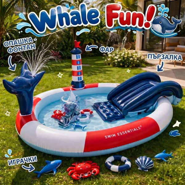 Пързалката осигурява непрекъснато забавление, а опашката на кита създава истинско удоволствие от играта, като пръска вода и се превръща във фонтан.