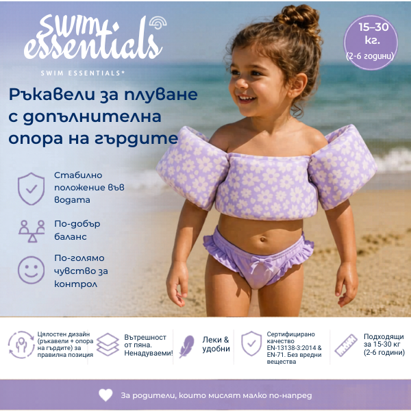 Swim Essentials: Ръкавели с допълнителна опора на гърдите за деца от 2 до 6 години - "Purple Flowers"