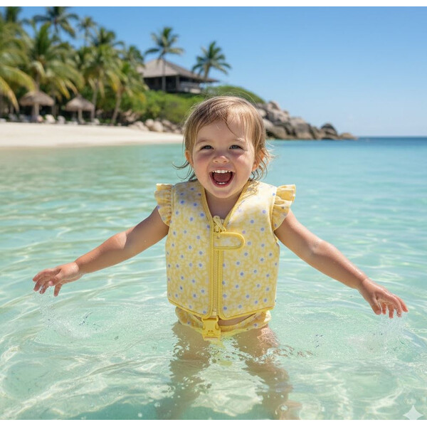 - Идеална за плаж и басейн, тя поддържа детето топло и безопасно в студена вода.