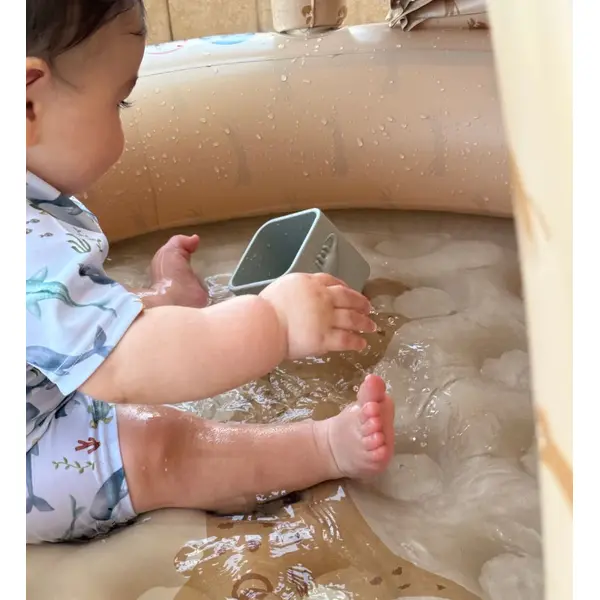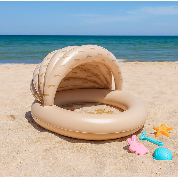 Надуваемият сенник в горната част осигурява защита от слънцето, а мекото дъно гарантира пълен комфорт и безопасност по време на игра.