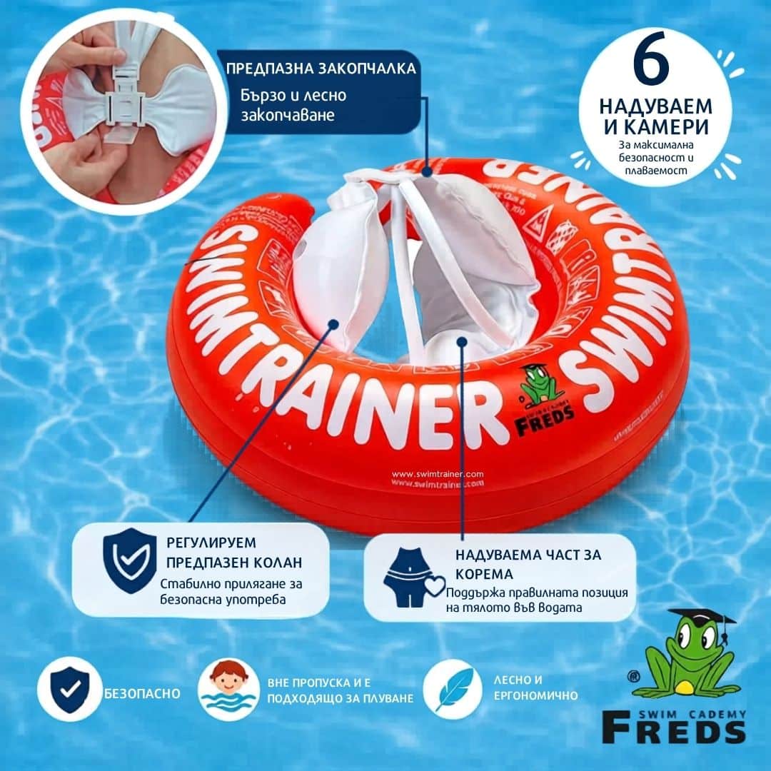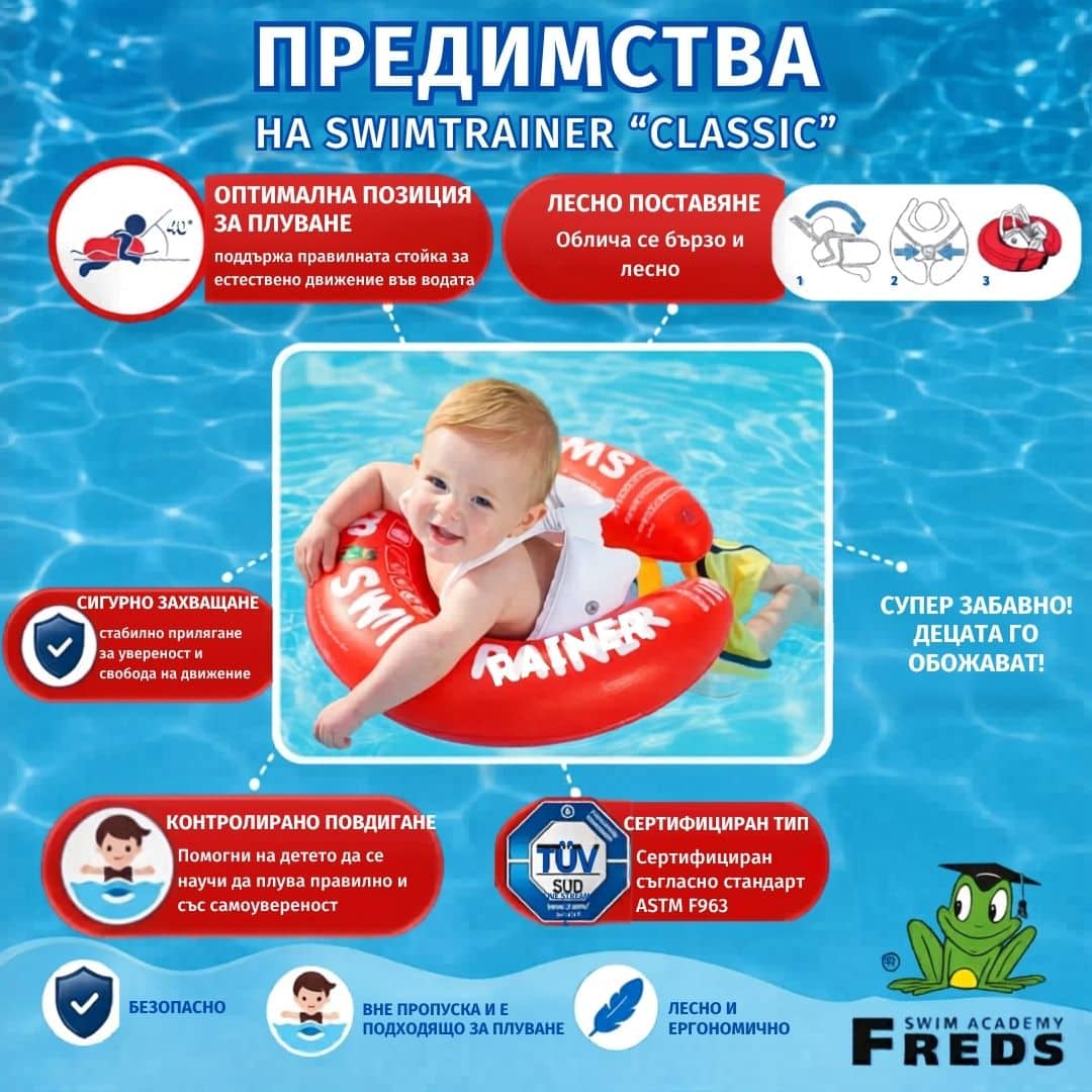 Swimtrainer Classic е иновативна тренировъчна спасителна жилетка, която помага на бебето или детето да се научи да плува безопасно, с правилна стойка и увереност.