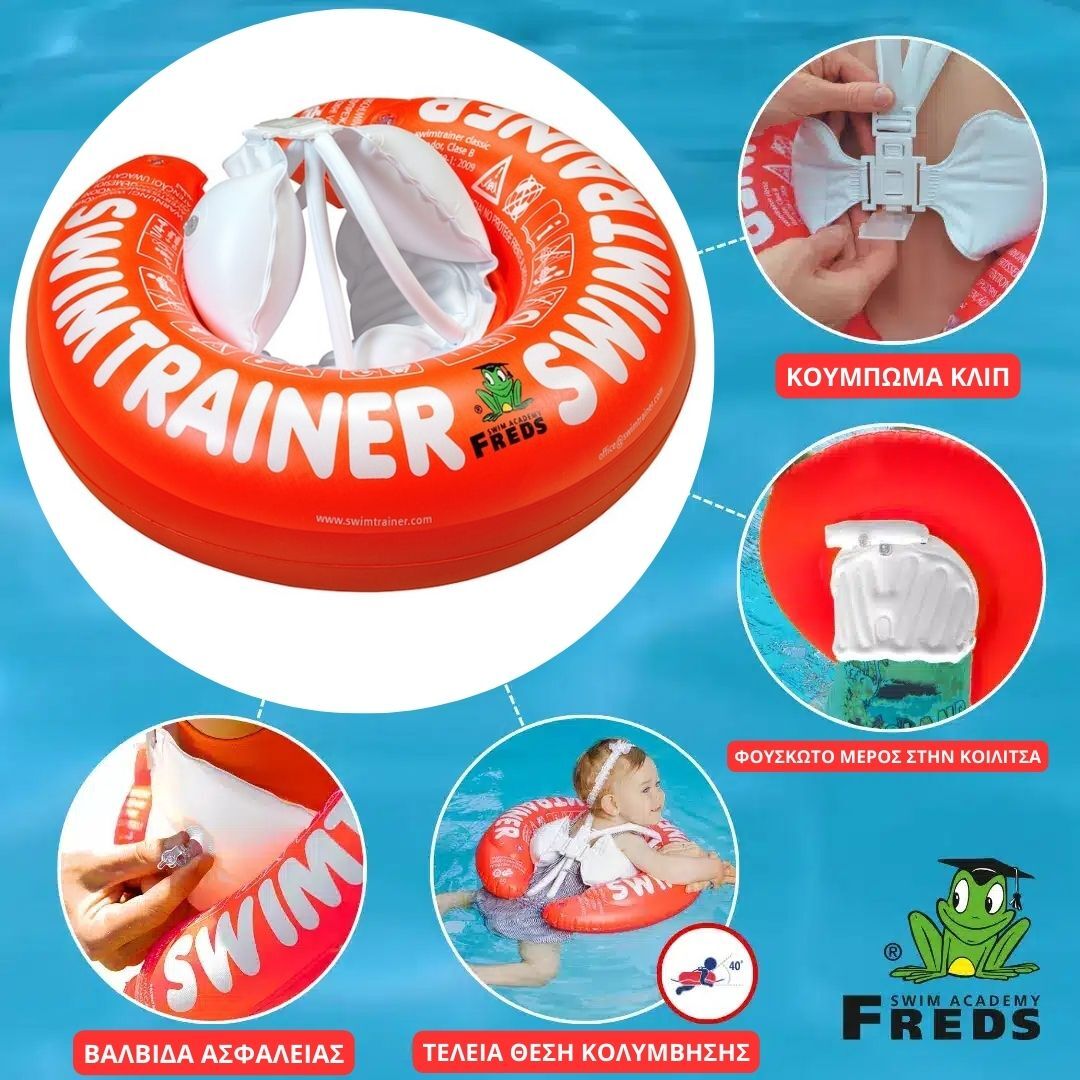 SWIMTRAINER "Classic" е специално проектиран, за да помага на вашето дете да свикне с водата от много ранна възраст, като осигурява опора, безопасност и педагогически подход към ученето на плуване.