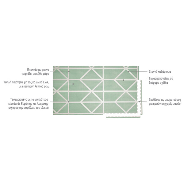 - Висококачествен, нетоксичен материал EVA с тънък принт на повърхността. Както принта, така и материала са тествани спрямо високите европейски и американски стандарти в отношение безопасност на материала. Не съдържат формалдехид, никакви тежки метали, без фталати. Със сертификат CE.