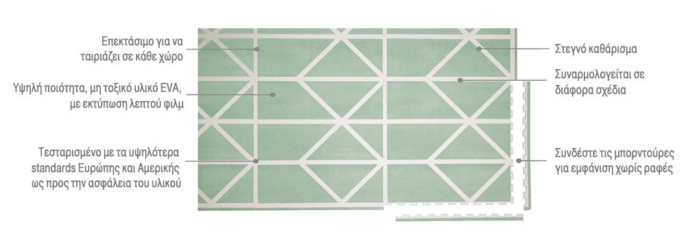 • Висококачествен, нетоксичен материал EVA с тънък принт на повърхността.  Както принта, така и материала са тествани спрямо високите европейски и американски стандарти в отношение безопасност на материала. Не съдържат формалдехид, никакви тежки метали, без фталати. Със сертификат CE.