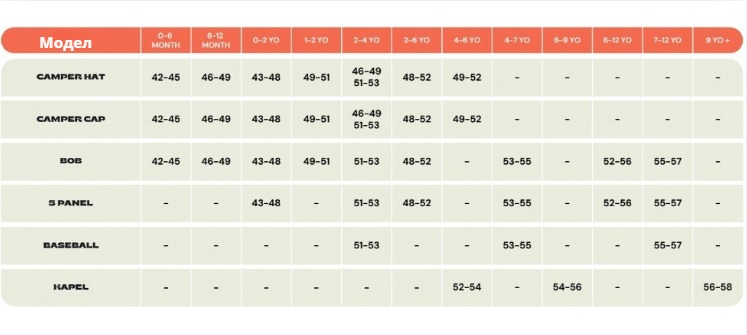 - Размер 0–24 месеца: обиколка на главата между 44 и 48 см.